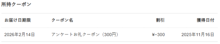 【マイページ】→【クーポン】から所持クーポンを確認できます。