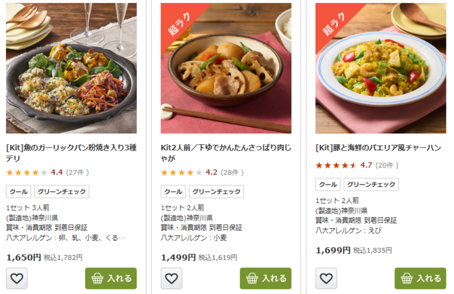 例えば、晩御飯用にミールキットを3種類とおかずを2種類、朝ごはん用に牛乳とパン、果物など選ぶことが可能です。